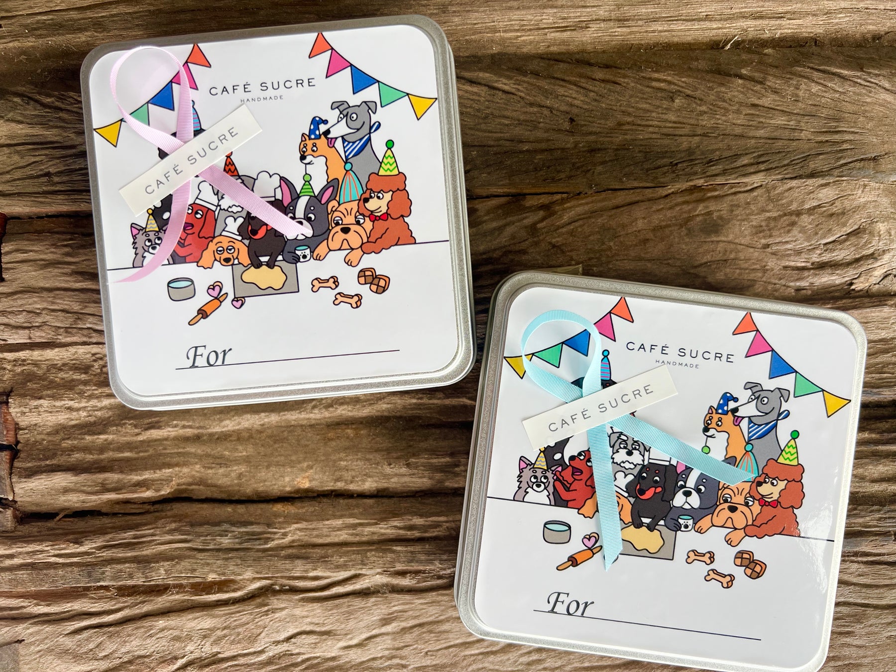 クッキーパーティーをしているワンコたちのイラストがとってもかわいいクッキー缶です。